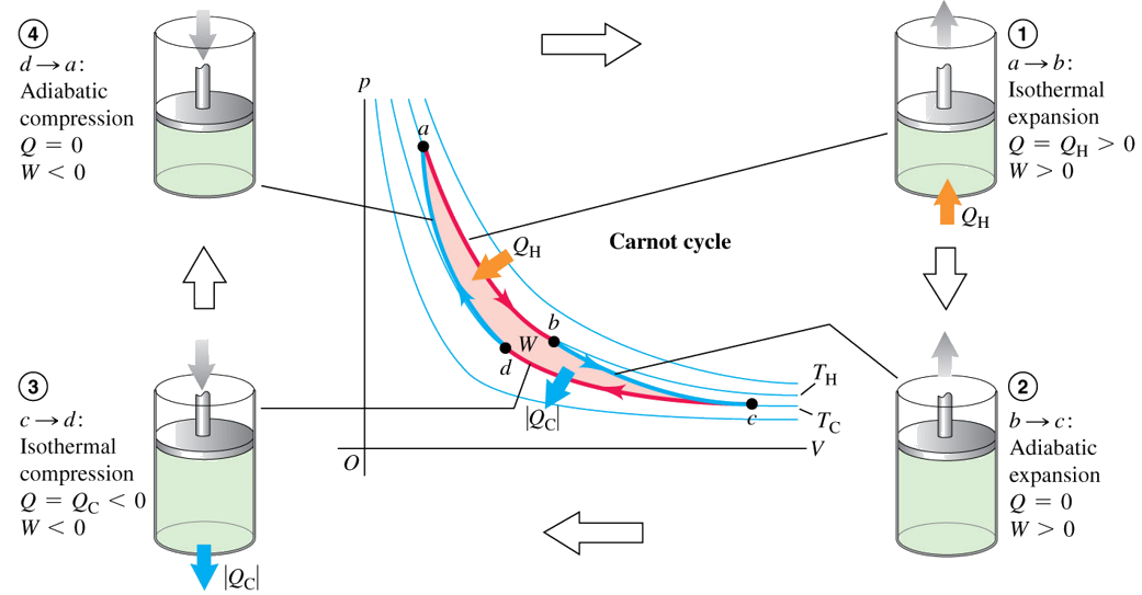 4. It is compressed adiabatically back to its initial state at temperature TH.
